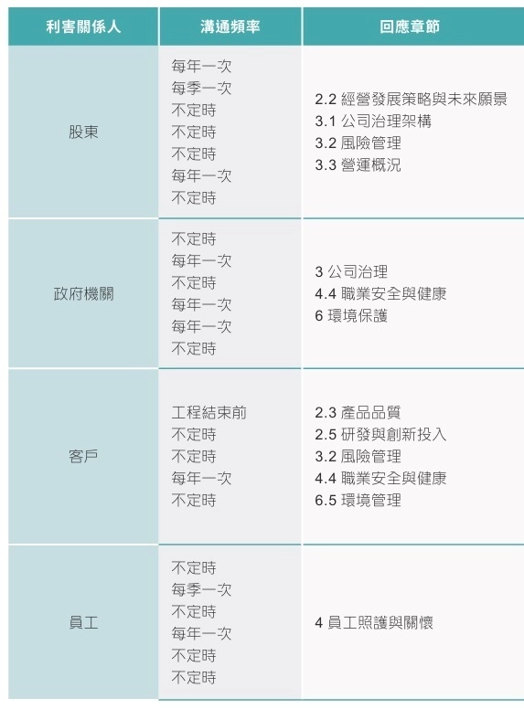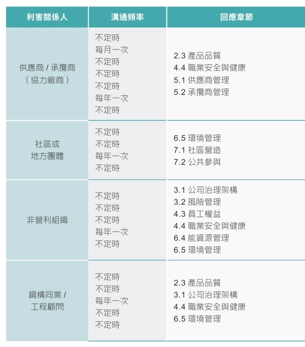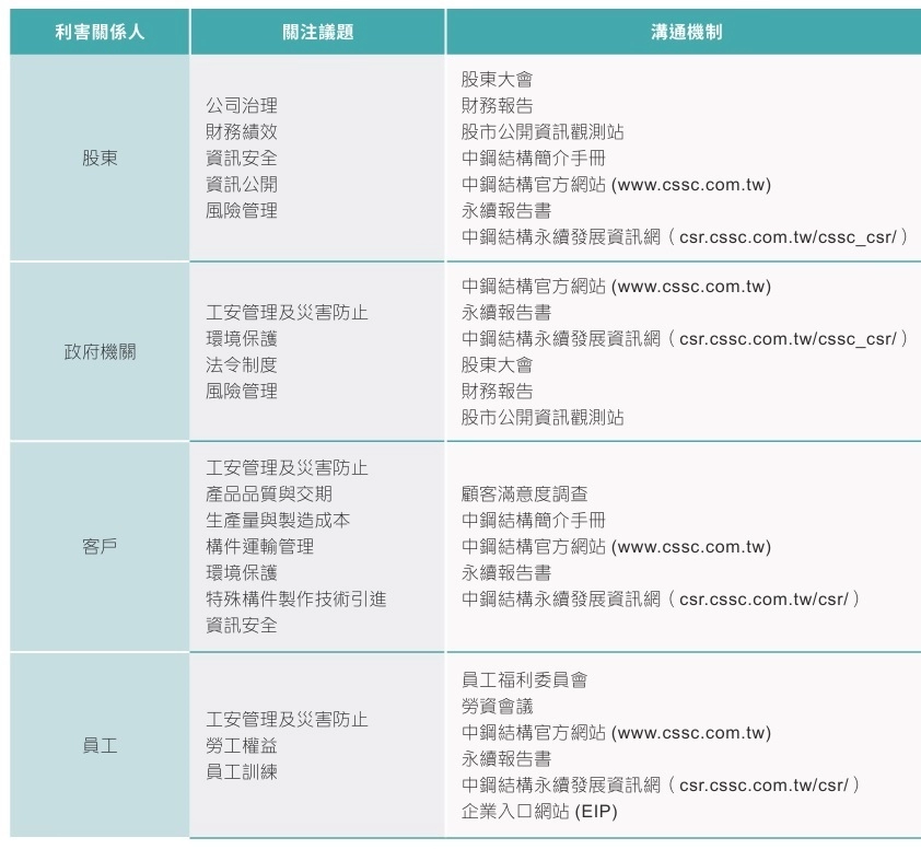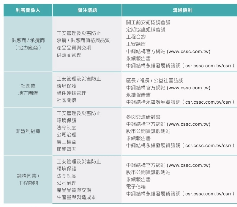 為追求企業永續經營,中鋼結構參酌各單位業務與同業的交流經驗,透過與利害關係人之溝通,回應利害關係人的關切議題,持續檢視及改善本公司永續發展執行成效。其中篩選出主要利害關係人為股東、客戶、供應商/承攬商、員工、社區或地方團體、非營利組織、鋼構同業/工程顧問及政府機關等共八類,再透過線上或書面問卷蒐集利害關係人對各項重要關注議題的關注程度,並依照利害關係人的關注程度與議題的衝擊程度,據此辨識重大議題,訂定重大議題之短、中、長期之目標。