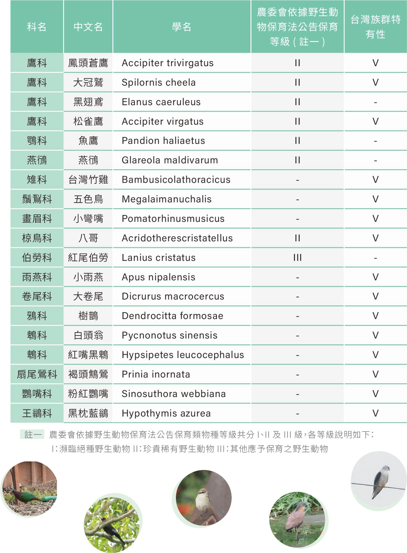 中鋼結構2024年廠區內可觀察到農委會公告保育類物種及國際 自然資源保護聯盟(IUCN)紅色名單內保育類鳥類如下: