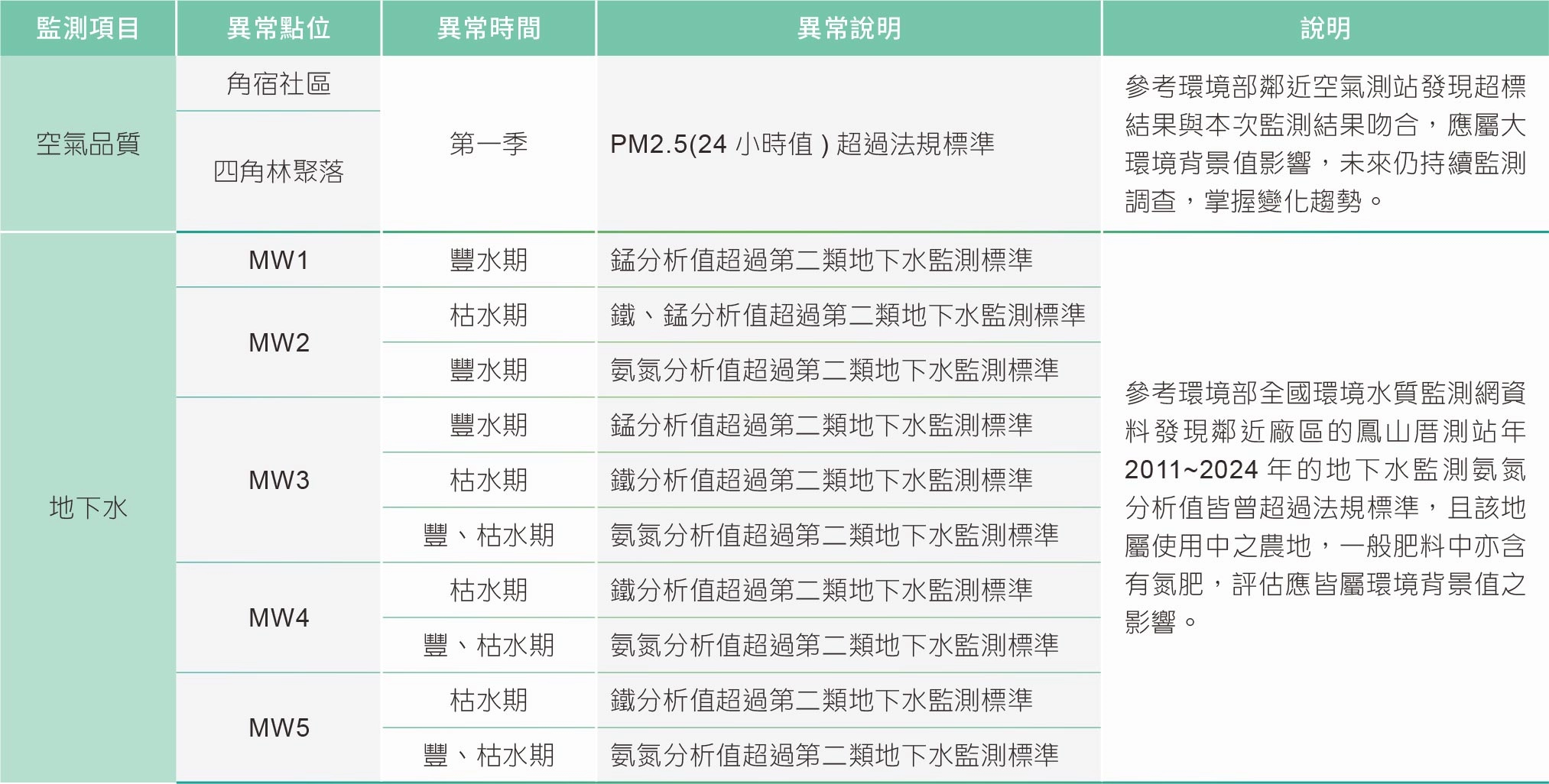 中鋼結構2024 年環境監測結果大部份均於正常範圍,部分監測項目異常項目說明如下:
