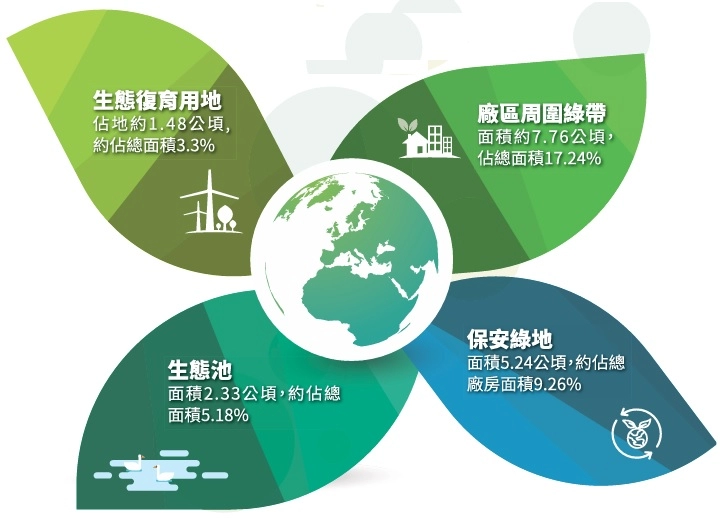 為兼顧生態保育理念,高雄廠生態保育區總計達16.81公頃(約 佔總面積37.4%),構成多層次動植物棲息空間,環廠綠帶除可降低鄰 近居民對工廠噪音之感受性,也可淨化空氣品質。其中生態池不僅具滯 洪功能,亦兼具生態與景觀效益;利用淺灘濕地、廣深水池、軟硬渠底、 軟硬護岸…等手法營造生物棲息環境,結合教育解說設施,發揮教育宣 導之功能,兼附廠區生態環境的平衡調節。