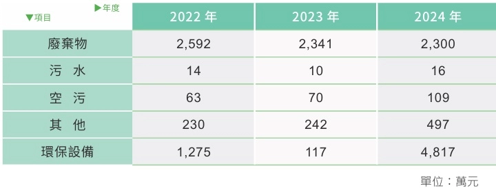 中鋼結構環保支出可區分為廢棄物處理費用(含一般廢棄物及事 業廢棄物)、污水處理費用、空氣污染防制費用(揮發性有機物)、 環保設備投資及其他(含固定污染源排放管道檢測費用、委託辦理許 可證展延費用等)。