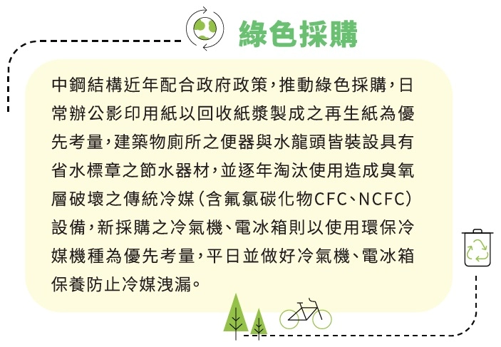 已於2017年通過ISO 14001:2015管理系統轉版驗證(有效 期限:2022/12/14至2025/12/14),後續每年持續定期審查,以品 質管理系統執行手法為基礎,妥善規劃性質相近的環境管理系統、 安衛管理系統及能源管理系統等三套系統整合運作,以發揮相輔相 成的功效,期望可提升效率、排除系統間運作矛盾點並降低成本;自 2021年起,每年持續依循ISO 14064-1辦理溫室氣體盤查及第三方 查驗,並於2022年完成ISO 14067每噸鋼結構產品碳足跡計算及第 三方查證。