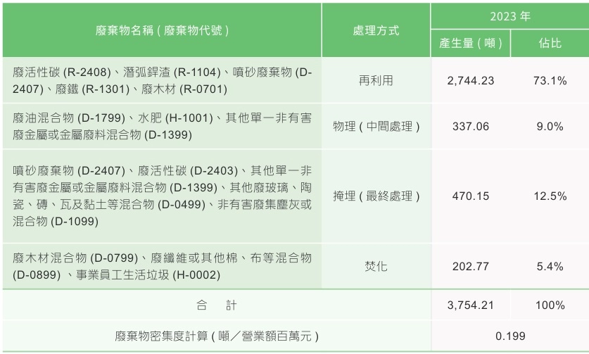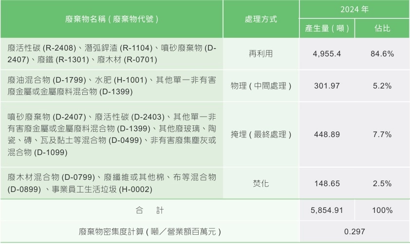 本公司廢棄物管理目標為減量及再利用,工廠產出之廢棄物以一般事業廢棄物為主,優先考量再利用,最後才委由合法清運廠商掩埋處理。其 中2023年及2024年度,高雄廠產出之廢棄物處理量,分別為2,666.5噸及3,826.4噸、官田廠產出之廢棄物處理量分別為1,087.7噸及2,028.6 噸;為審視推動廢棄物減量及再利用成效,擬設定事業廢棄物(R類)委外再利用百分比(委外再利用量/事業廢棄物委外總量)作為量化基準,而 未來年度管理目標規劃,分別短期(114年)≧5%、中期(119年)≧20%、長期(139年)≧40%。