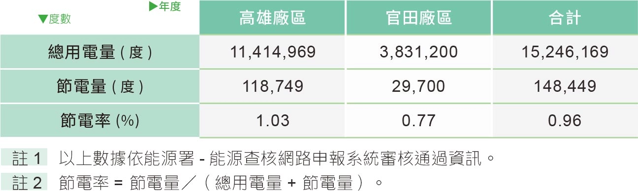 其中2024 年持續推動更換LED 燈(高雄廠區辦公室及維修間、 官田廠區塗裝作業區)及高雄廠傳統潛弧銲機改善為變頻銲機(預估 節電198,076 度),並規劃2025 年進行高雄廠及官田廠辦公室及廠 房照明更換為LED 燈、高雄廠傳統電銲機為變頻式電銲機、公務車 汰換為油電車等減碳策略。