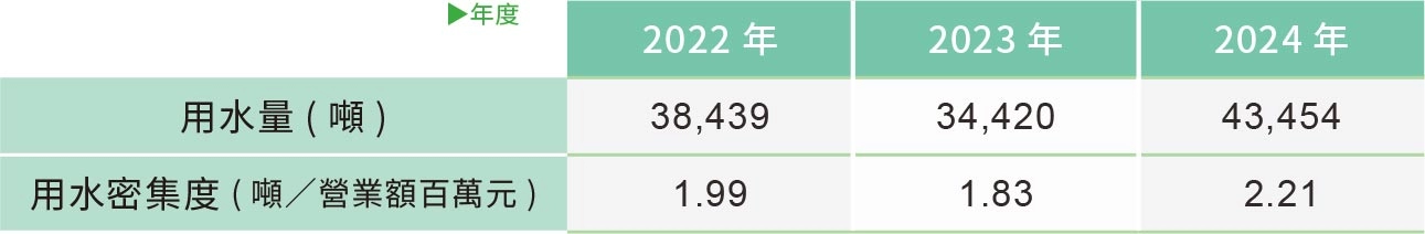 本公司用水管理政策為循環回收,以降低用水量,而自來水使用量與 溫室氣體範疇三第三方查驗數據一致,其中高雄廠2023 年及2024 年度的自來水使用量分別為27,479.2 噸及32,033.9 噸、官田廠 2023 年及2024 年度的自來水使用量分別為6,940.1 噸及11,419.9 噸。本公司自來水主要用途為員工生活用水、現場清潔工作使用等, 透過生活污水回收淨化後以及雨水回收淨化,可作為廠區內澆灌使 用,且本公司之水龍頭接裝設具有省水標章之節水器材;高雄廠區設 有雨水回收系統,其中2024 年約回收4,377 公噸雨水做為廠區澆灌 使用(約佔用水量9.2%);為審視推動降低自來水用水成效,擬設 定回收水再利用率(廢水及雨水回收再使用量/ 總用水量)作為量化 基準,而未來年度管理目標規劃,分別短期(114 年)≧ 5%、中期 (119 年)≧ 7%、長期(139 年)≧ 10%。