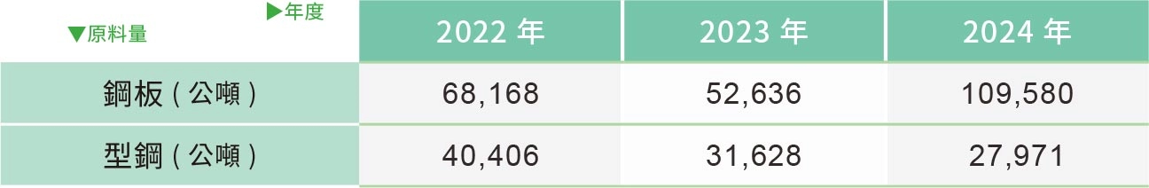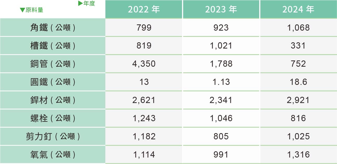 中鋼結構產品為各式鋼結構製品,鋼板及熱軋型鋼為最主要原料,附屬原料為銲材、各式鐵材、螺栓等。電能為製程所使用最大宗之能源,其他 附屬能源消耗為:液化石油氣(LPG)、二氧化碳、氧氣、自來水,且中鋼結構對於機具設備以及氣體儲槽皆訂有保養計畫,平時依據保養計畫週期 進行機具設備檢查與保養,每日有專人負責儲槽供應開關、巡視,中鋼結構2012~2024 年期間並未發生氧氣、二氧化碳、LPG 等氣體洩漏事件。