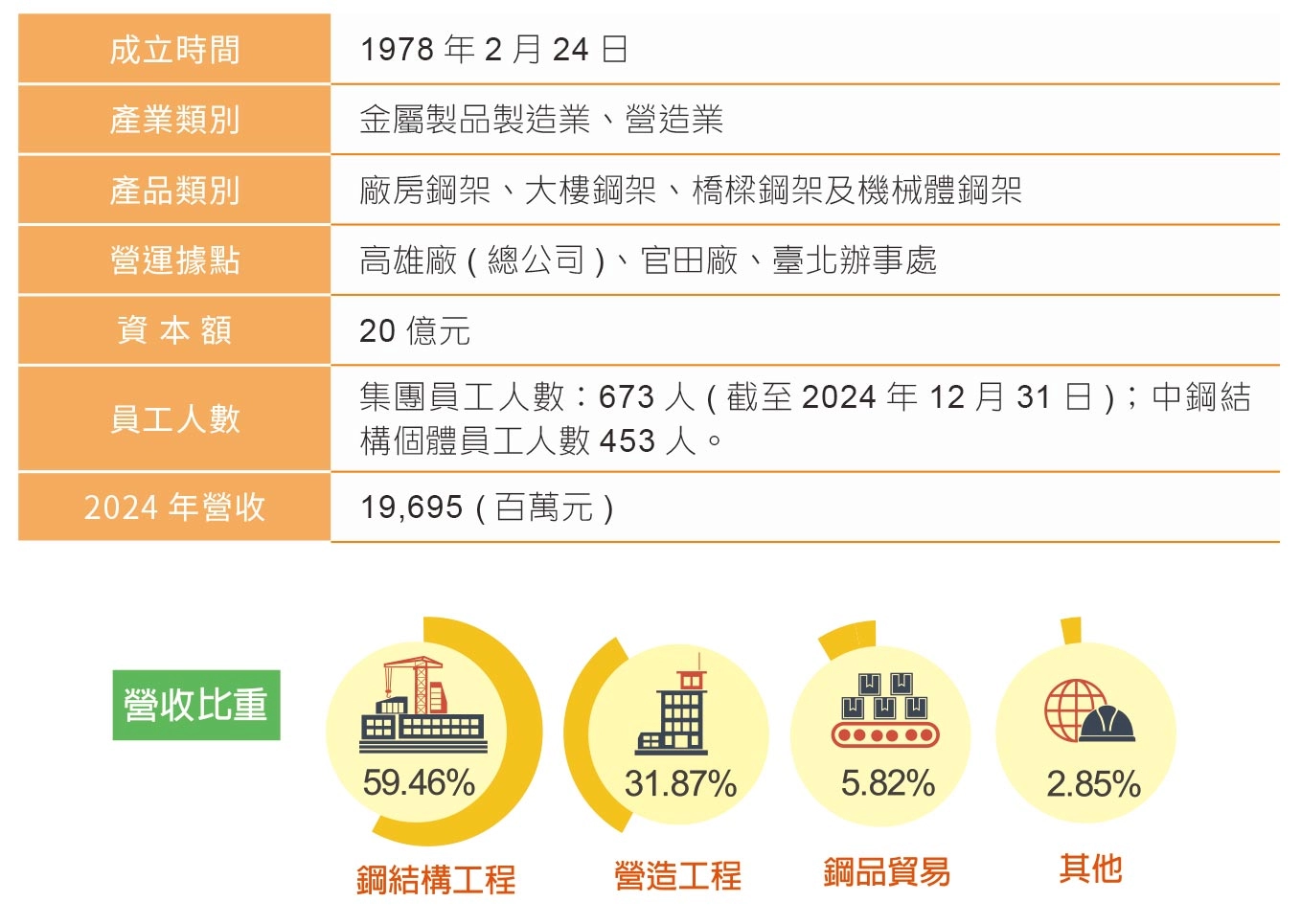 中國鋼鐵結構股份有限公司(1992年1月21日正式掛牌上市,股票代號:2013中鋼構)創立於1978年2月24日,是台灣首創以鋼結構製造與安裝為專業的公司,以完全自主的技術與生產能力滿足客戶最高品質、合理價格、最短工期的要求。中鋼結構在台灣高雄及台南有一座製造工廠,年總產能約為160,000公噸。