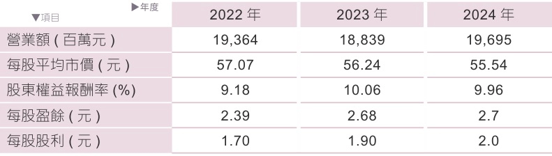 2024 年銷售額19,695,058仟元,營運成本為18,635,059仟元,員工薪資與福利為1,426,243仟元,股利發放380,000仟元,稅捐222,324 仟元,社區投資2,217仟元,保留盈餘2,189,128仟元。