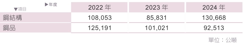 鋼結構製裝工程及鋼品貿易為中鋼結構主要銷售主力,鋼結構製 裝工程2024年銷售量為130,668噸,較2023年增加52.24%。