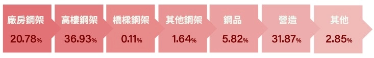 中鋼結構2024年度主要營運產品大致區分為廠房鋼架、高樓鋼架、 橋樑鋼架、其他鋼架及鋼品貿易,產品項目佔銷售金額比重如右圖所示: