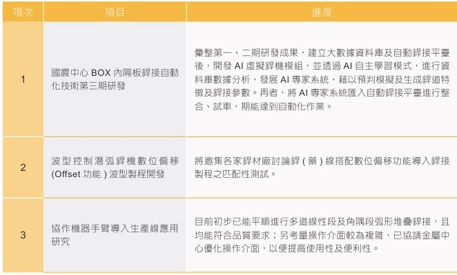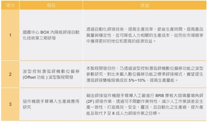 主要研究方向為:製程及產線開發與改善、新電銲設備導入製程運用、現場設備的改良及環保節能設備導入(如:變頻銲接設備、雷射加工機 等)及設備自動化(如:多功能加工機、機器人系統等),藉以因應台灣面臨少子化、人力老化及產業升級等現況。設備製造研發與改善,必將是 未來公司發展的趨勢。
