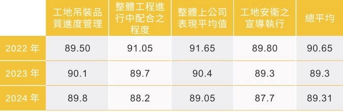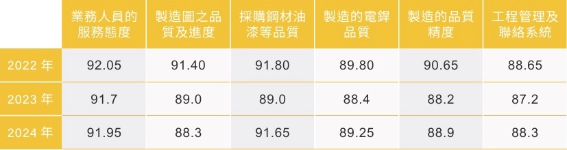 顧客滿意是中鋼結構公司的經營理念,期望公司好的產品可以獲得顧客的認同,顧客的建議與抱怨是驅使中鋼結構更臻卓越的原動力。每個專 案工程結束前,鋼構業務處均會辦理顧客滿意度調查,調查結果作為後續努力改善之依據以及發展目標。2024年顧客滿意度調查以單一分項為目 標值,選定「業務人員的服務態度」作為目標標的,該項次平均值為91.95分,達成度預設目標(85分)。