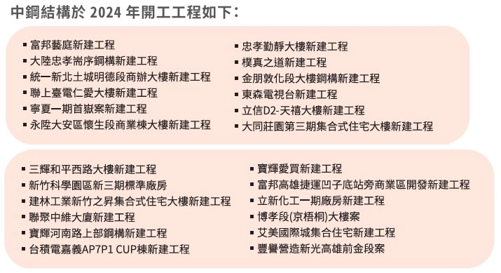 中鋼結構產品遍佈全世界,近來由於國內電子廠房投資案逐漸減少,目前多著力於國內公共工程及住宅大樓,並配合集團政策,逐步朝向海外 發展,近年並朝向東南亞等新興市場進軍,以創造投資人最大利益;中鋼結構於2024年開工工程,若以工程地理位置區分,北部工程約62%,中 部工程13%、南部工程約25%。